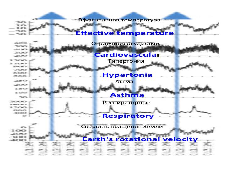 But this does not exclude possibility of the hypothesis that cosmic energies related to the Earth's rotation particularly affect Russians. And it may happen that this is not only one of the factors of the morbidity rate growth in our country (similar relationships occur in Ukraine, Byelorussia), but also of the social transformations. We shall not repudiate such a possibility.