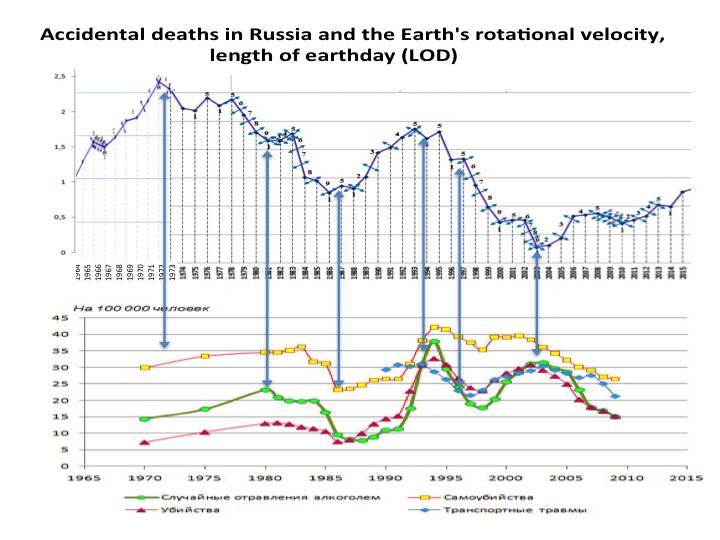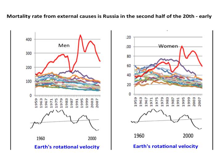As the Earth's rotational velocity is growing – the number of diseased in Russia is also growing at the scale of individual years. As the Earth's rotational velocity is falling – the number of diseased is also falling at the scale of years. Evidently, this is one of the factors that influences the number of diseased. But at this point in time we have such trends agreement.