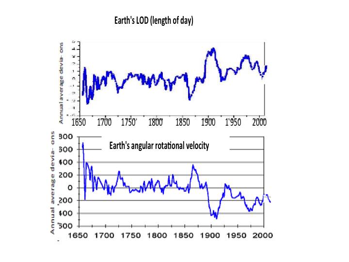Consider that the length of day (LOD) graph is symmetrically opposite to the graph of the Earth's angular rotational velocity. According to LOD, slowdown of the Earth's rotational velocity is associated with the longer duration of the Earth's day.