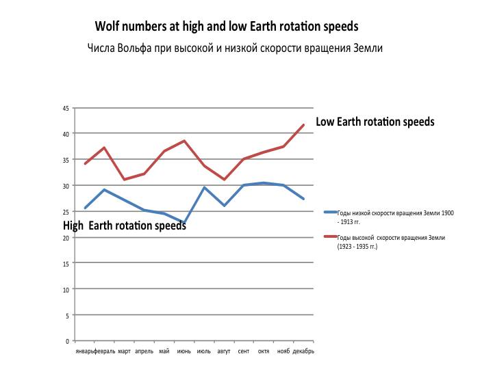 Notice, how the combination of turns in the Earth's rotational speed and intensity of solar radiation is consistent. The low values of solar intensity on turns are consistent with high values in turns of gravity-spin energies, energies of the cosmic ether. It is the ratio of these energies had been substantiated by V. Dyatlov through the law of the full electromagnetic and gravity-spin currents. According to his calculations, the gravity-spin energy growth is combined with falling of electromagnetic energy if we are talking about a separate cosmic system. In his terminology it is vacuum domain. But it is on the scale of centuries.