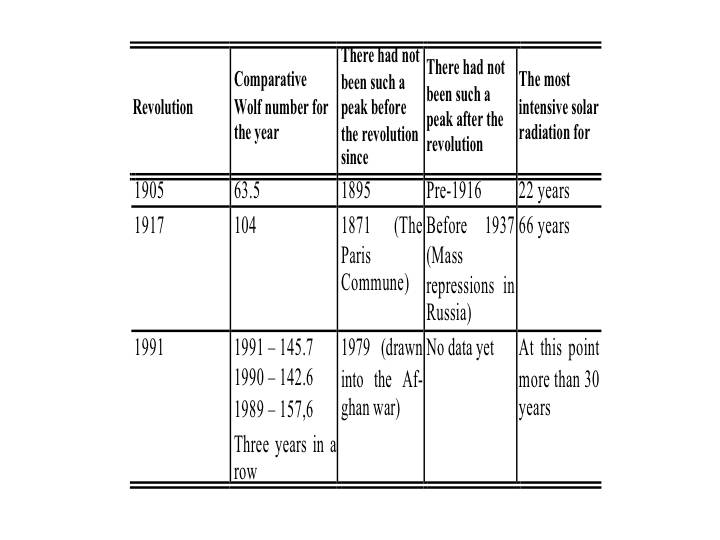 Peaks of solar activity are also peaks of social protest and revolution. Social roles that had previously been accepted (stable social dynamic stereotypes) – were swept away. Society was ready to accept new roles, to begin to live according to new customs, traditions, and laws. In the language of the physiology of higher nervous function, the apparatus for closing and opening nerve impulse circuits has succumbed to change to a much greater degree than usual.