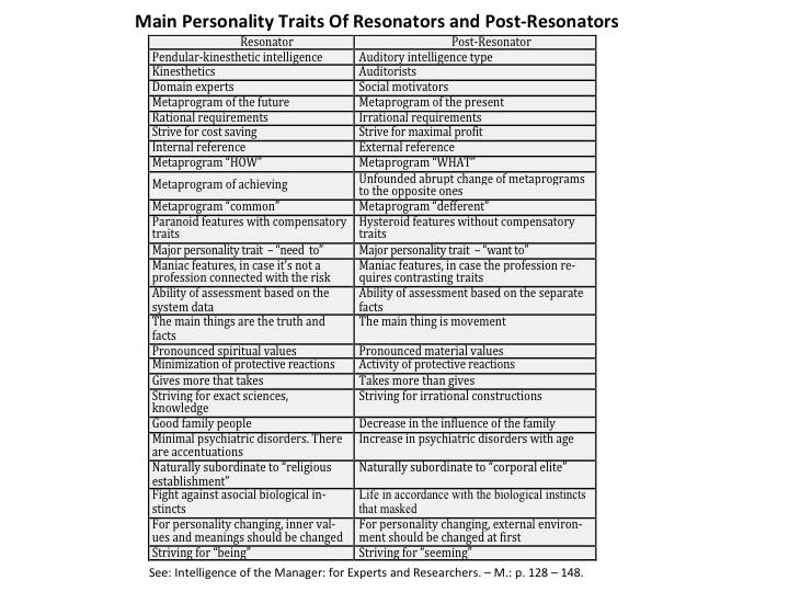 Resonators are the people whose activity is adequate to cosmic energies. They have enough energy to build an accurate picture of the world and to transform it and themselves. Whereas post-resonators do not have this energy and are forced to earn for a living by means of imitative behavior, often with the help of words, using trance guidance techniques. They are often good talkers, but bad practitioners. However, their techniques of influence on surrounding people are so perfect that they can cajole their chiefs for years using their skills. EEG techniques and other methods help to identify these different types of people in time (resonators and post-resonators, type 1/1 and type 5/5).