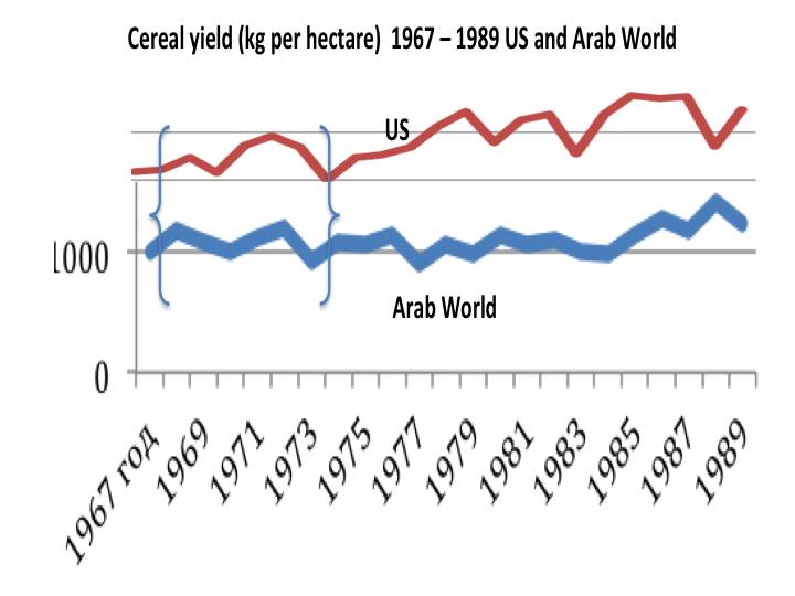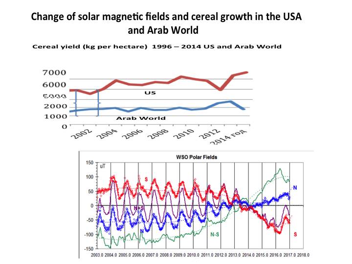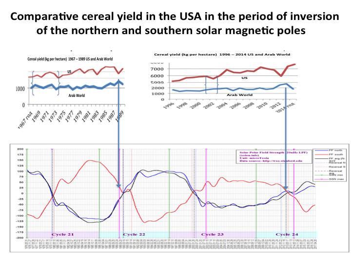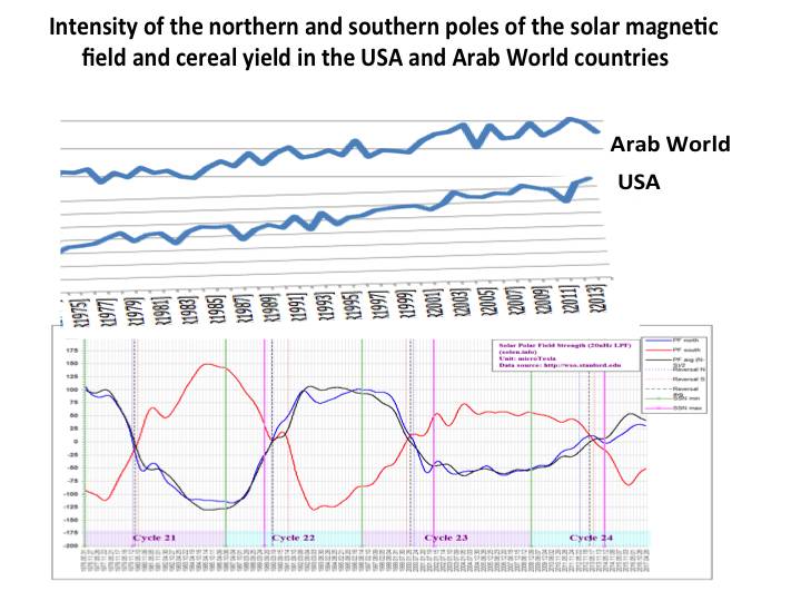 On the graph above the cereal yield in Arab countries and in the USA is time-coordinated with the change of intensity of the solar magnetic field.