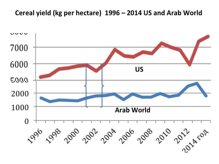 In the USA, cereal yield is higher than in Arab countries when the northern magnetic pole is positive. With the sign change of the solar magnetic pole the graph of cereal yield growth in these countries diverges. For the cereals that grow in the USA the period when the northern magnetic pole has a positive charge is more favorable. Whereas for the cereals that grow in Arab countries the period when the northern magnetic pole has a negative charge is more favorable. But this is also connected with the Earth's rotational velocity.