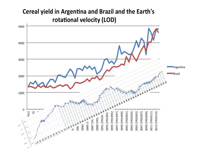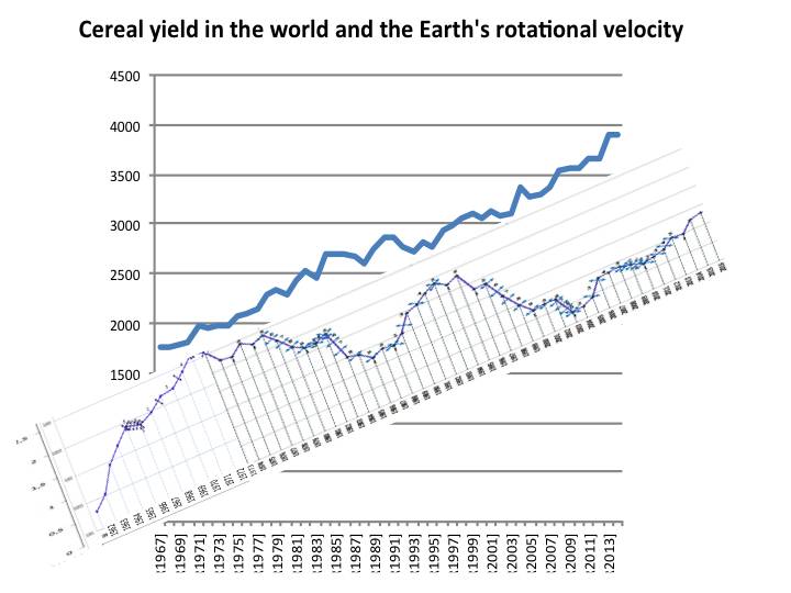 There is an analogy. Is there a relationship between the cereal yield growth in the world and the Earth's rotational velocity?