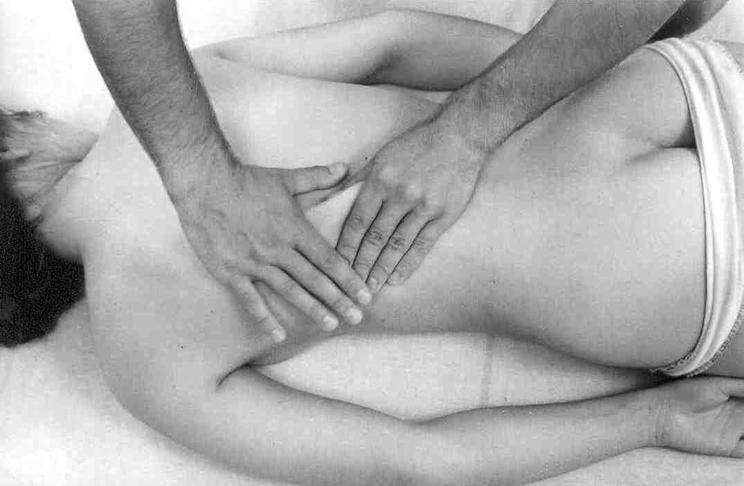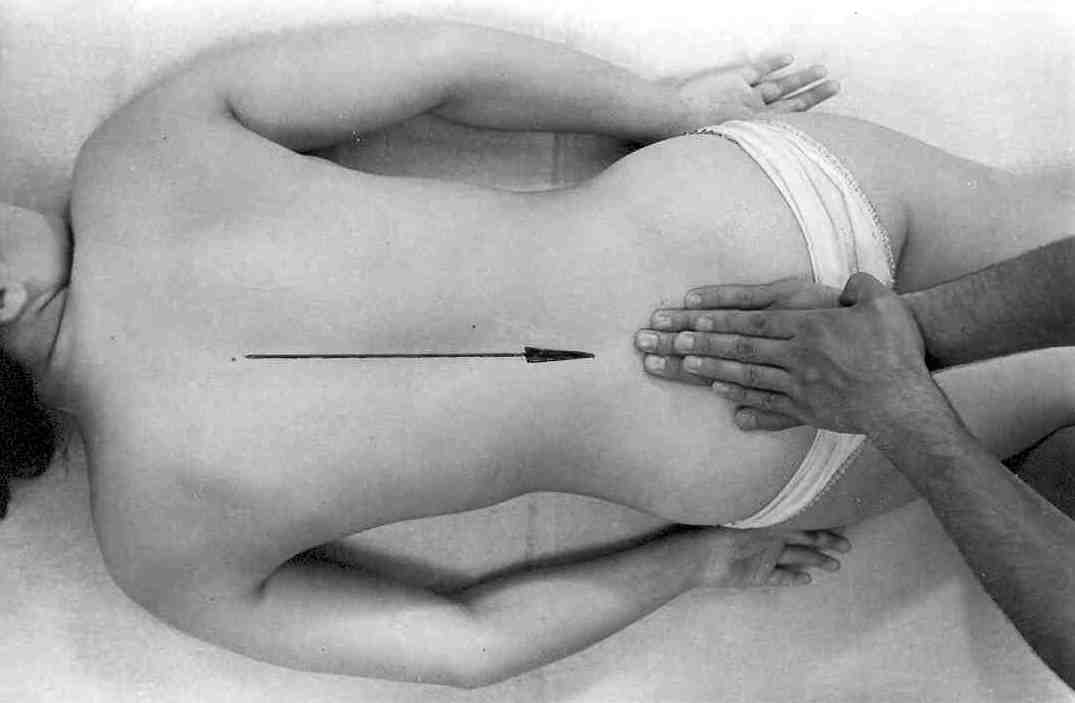 Массируемый лежит на животе, голова повернута набок, руки вдоль тела. Массажист располагается с левой или правой стороны от пациента и кладет ладони на область поясницы (рис. 1).