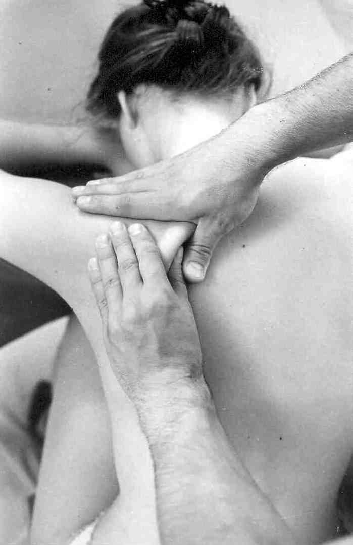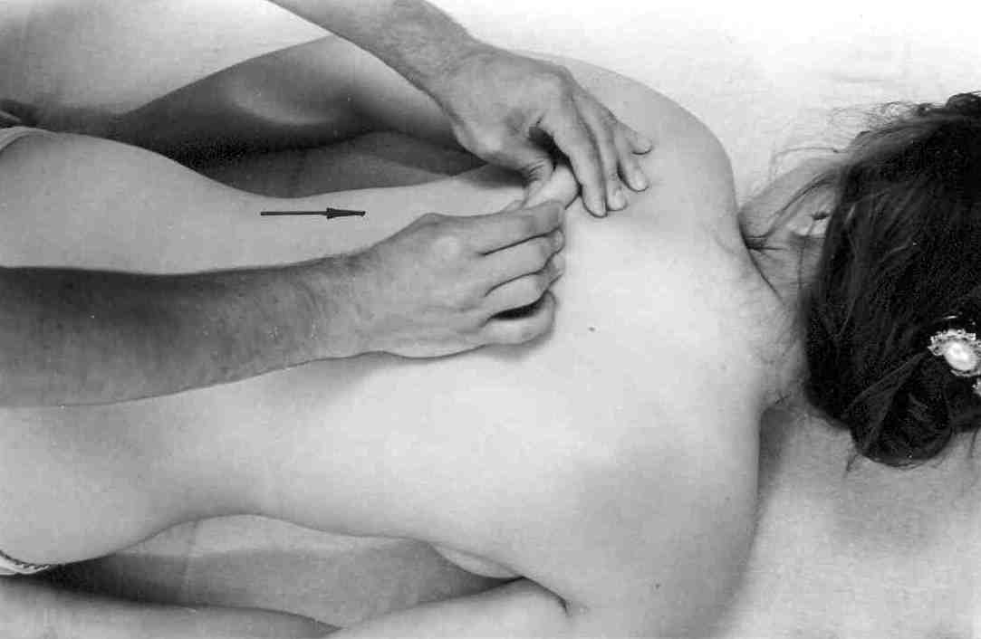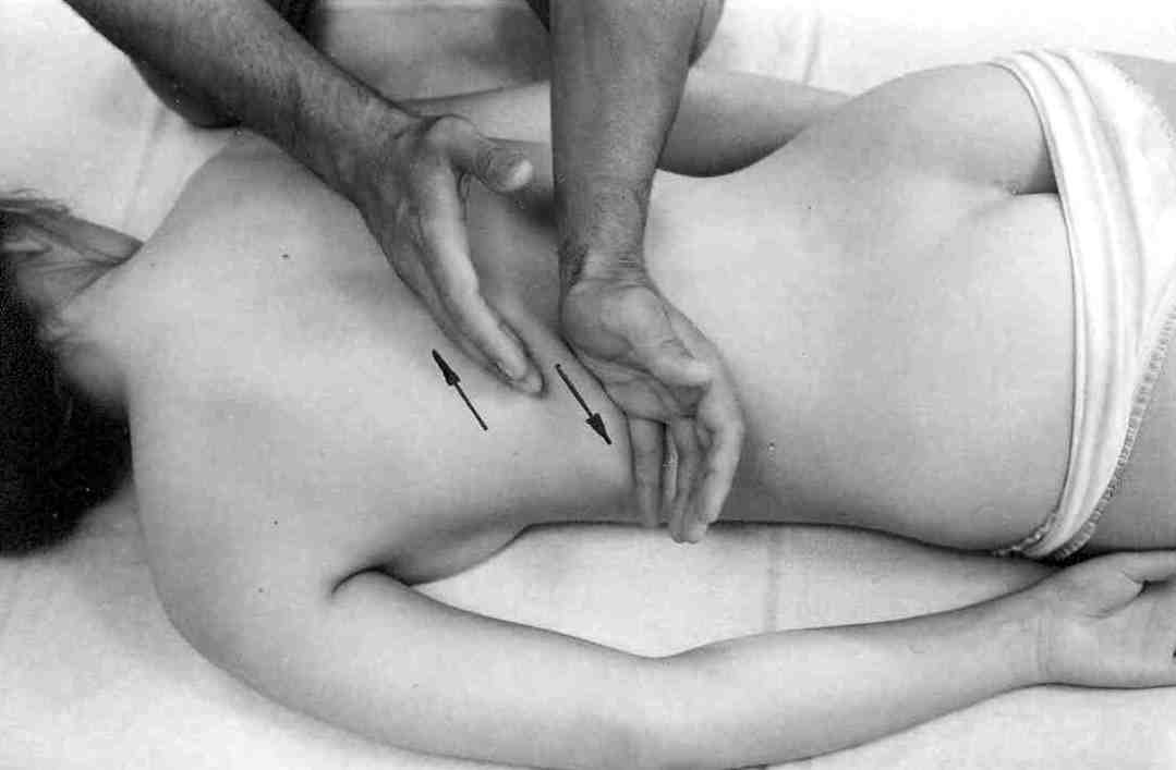 Разминание лопатокПосле проработки мышц спины переходим к воздействию на более глубокие слои – это места крепления мышц и надкостница.