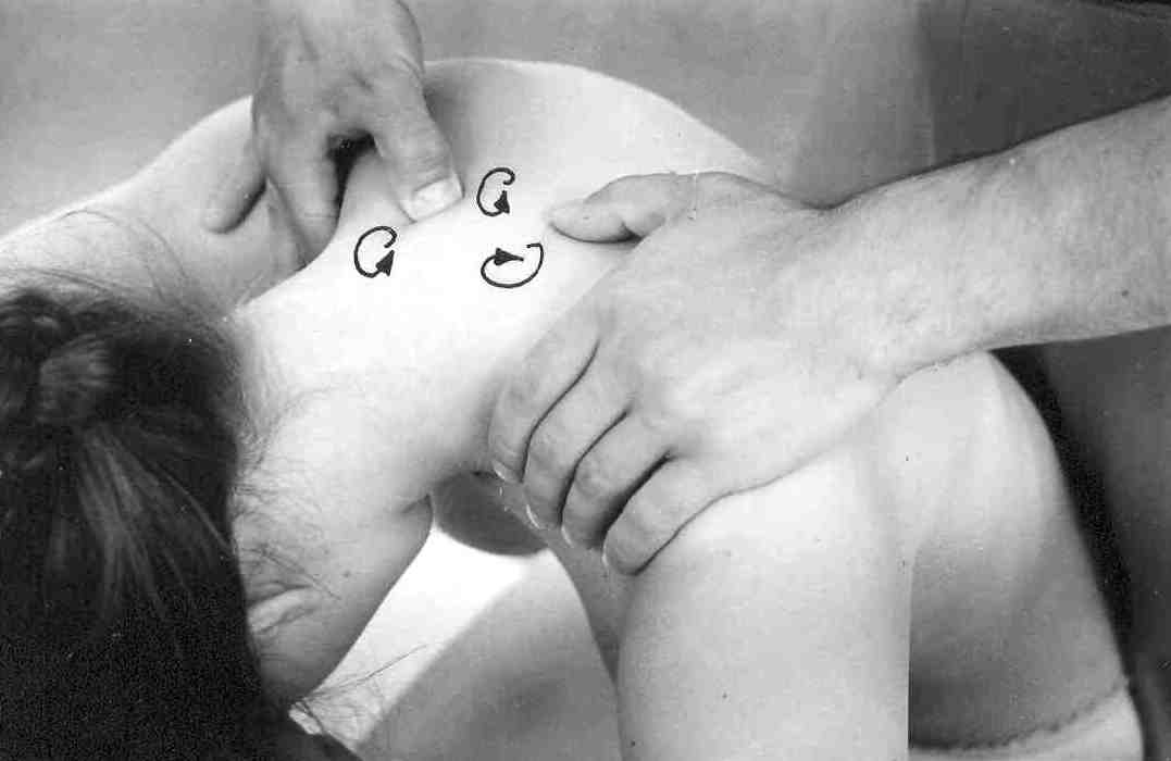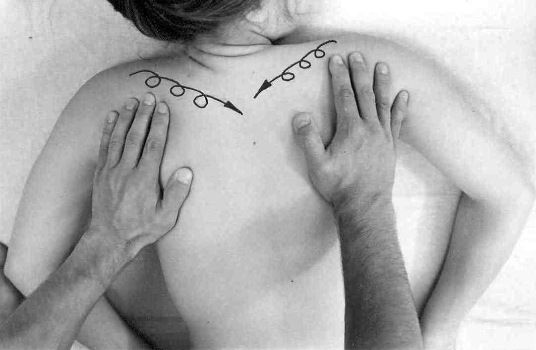 От нижнего угла лопаток прорабатывайте надкостницу вверх тоже попеременными движениями, но уже от позвоночника. То есть, если вначале правая рука вращалась по часовой стрелке, а левая – против, то сейчас они меняются ролями.