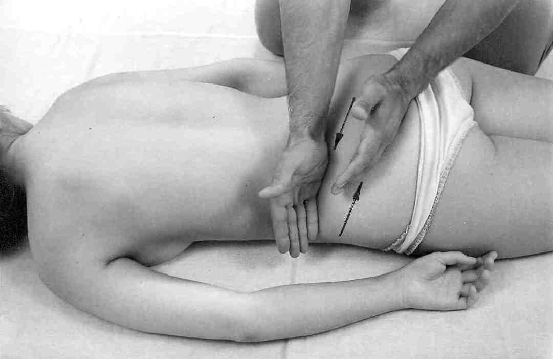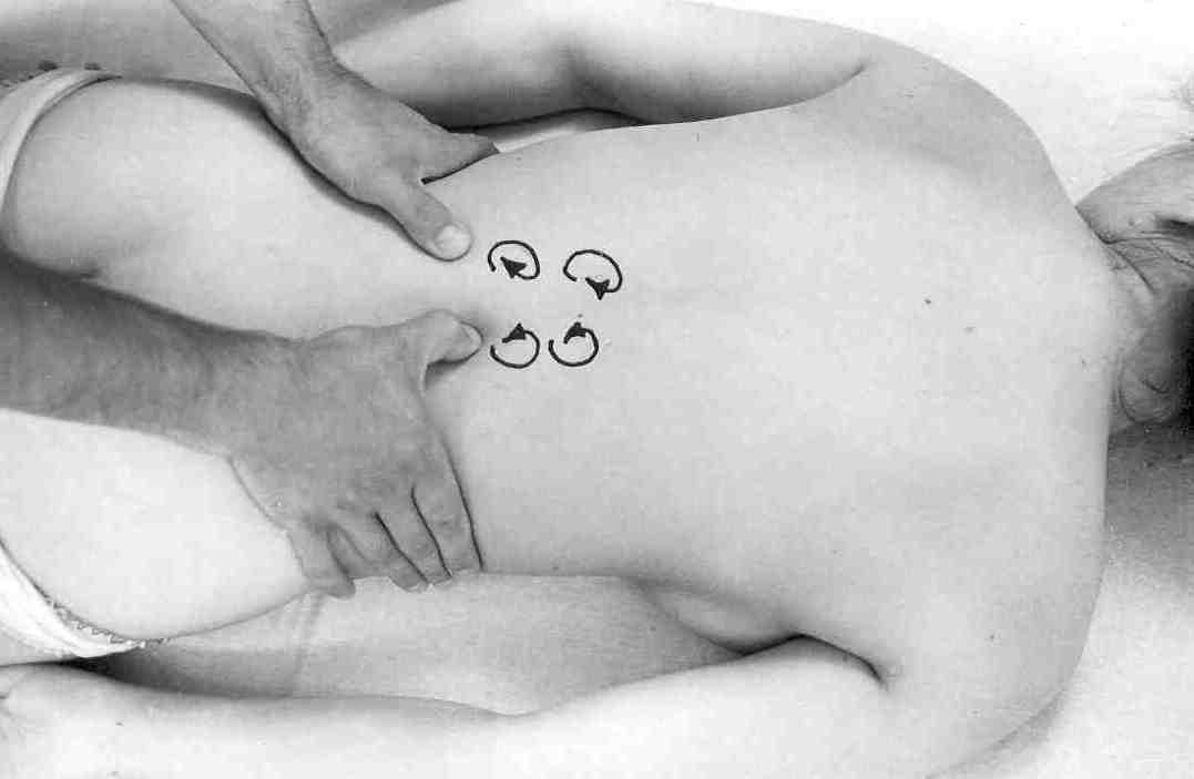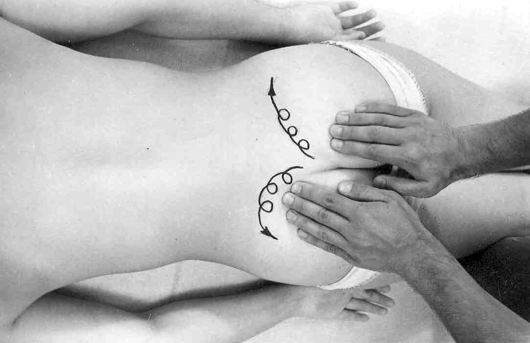 Начиная с крестца, вновь попеременными движениями, проникая сквозь мышцы верхними фалангами пальцев, проработайте надкостницу на гребных водвздошных костей. Если мышечный слой большой – можно вести массаж кулаком или локтем, но тоже круговыми движениями.