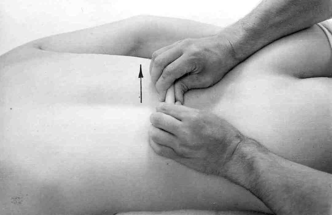 Воздействие на промежутки между остистыми отростками позвонковПервый способНачиная с поясничного отдела, большими и указательными пальцами захватываем (полностью!) часть ткани и делаем короткий и резкий рывок вверх. При этом может быть слышен легкий щелчок. Дойдя до грудного отдела, закончить (рис. 15).