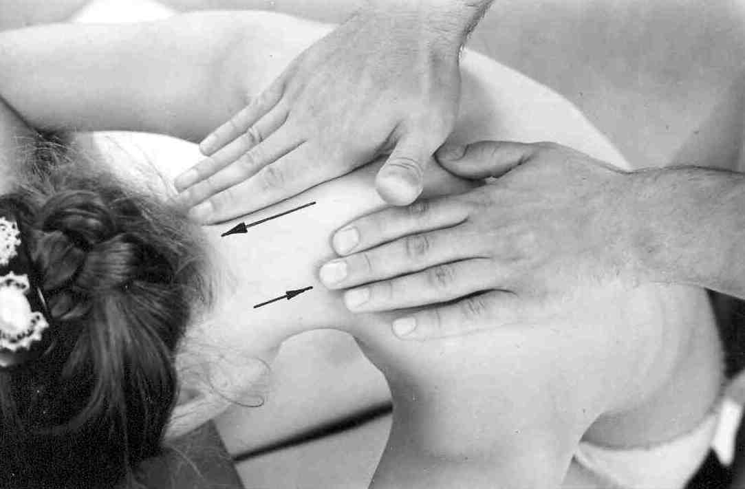 Разминание затылочной части производится от центра к периферии попеременными спиралевидными движениями кончиков пальцев. Проработка ведется по трем линиям, заканчиваясь на нижнем крае черепа под левым и правым ухом (рис. 24).