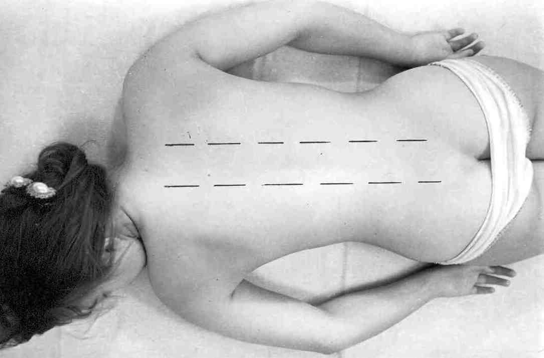 Через некоторое время после начала воздействия на спине вырисовывается очень интересная картина: покраснение вдоль позвоночника (рис. 6). Но вы сразу обнаружите, что некоторые места не изменились. Зная сегментарное строение позвоночника (а об этом речь пойдет при рассмотрении сегментарного массажа позвоночника), нетрудно определить пораженные органы. Соответственно в дальнейшем надо хорошенько эти участки тела проработать.