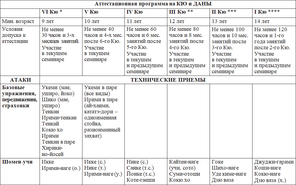 * При подготовке на 6 Кю лицам до 18 лет необходимо сдать комплекс ОФП (см. Программа 10–7 кю)