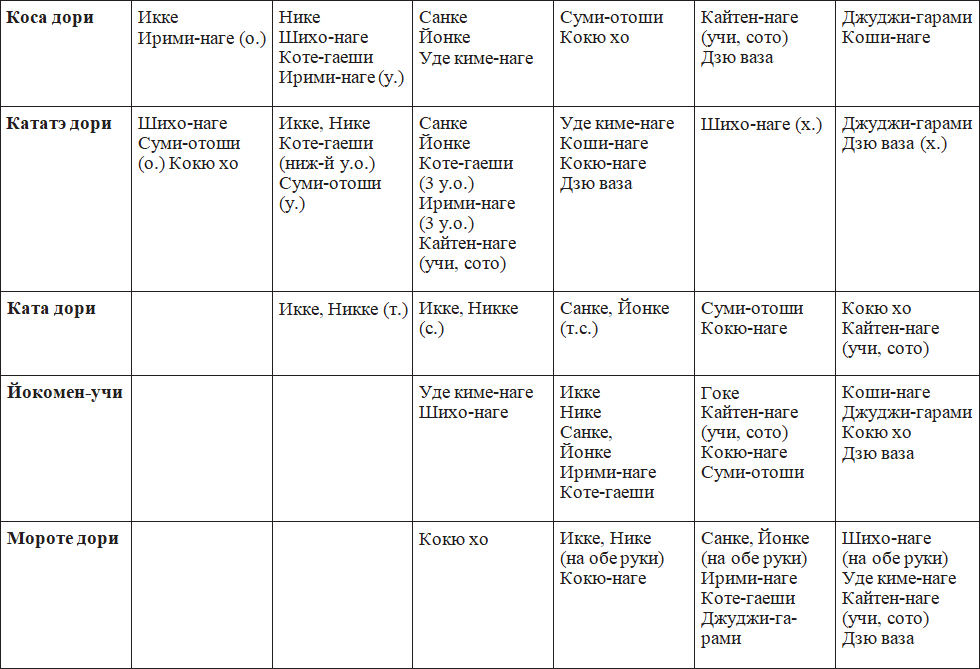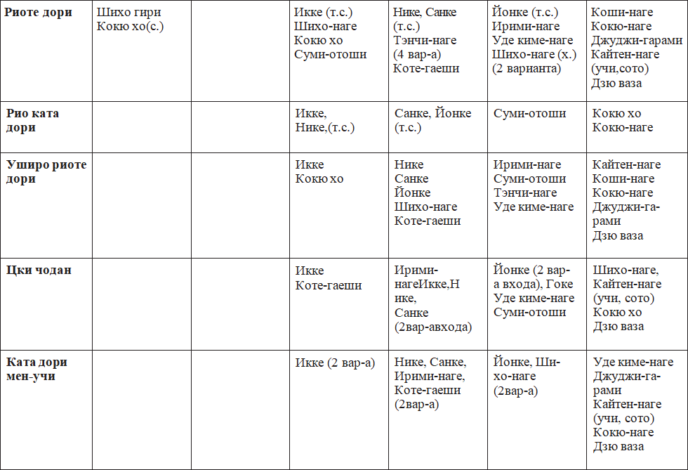 **** При подготовке на 1-й Кю необходимо изучить все возможные варианты защиты от уширо кататэ дори кубишиме, уширо рио ката дори, уширо эри дори, муна дори, уватэ дори, шитатэ дори, хиджидори, цкидзёдан, уметь выполнять все техники в положении сувари-вадза и ханми-хандачи-ваза, изучить варианты защиты от противника, вооруженного танто, а также варианты защиты от атак мае-гери, маваши-гери, йоко-гери