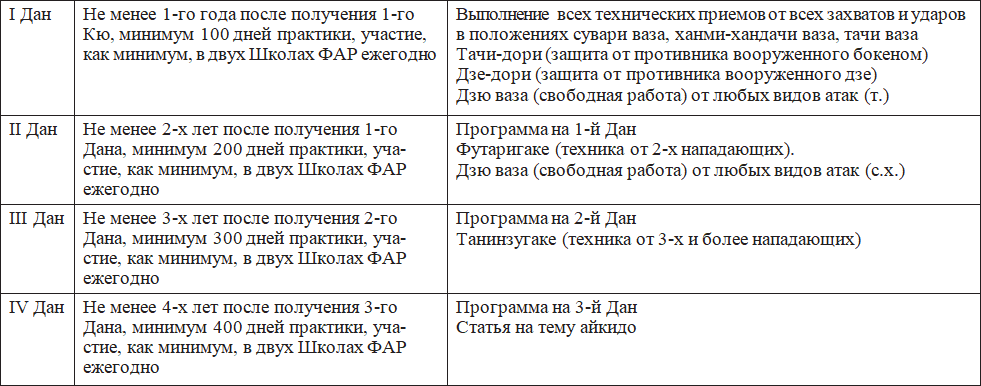 В таблице 1 представлены требования к аттестации в Айкидо Айкикай. Перед началом процедуры айкидоисту нужно убедиться, что у него есть необходимое количество тренировочных дней до подачи заявки на экзамен.