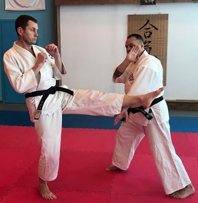 2 вариант: Уке наносит удар правой ногой. Тори смещается вправо и ставит нижний блок левой рукой, отклоняя удар уке и одновременно прикрывая лицо с левой стороны правой рукой. Также можно блокировать и левую ногу.