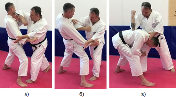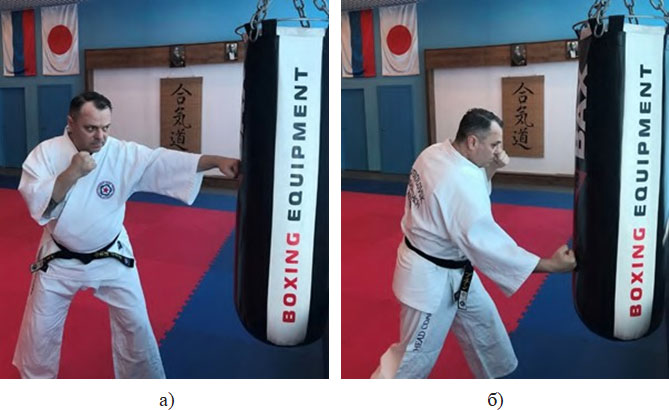 Рис. 11. Техника выполнения прямого удара вертикально расположенным кулаком (сейкен), где: а) положение бьющего кулака относительно мишени; б) положение айкидоиста в момент нанесения удара