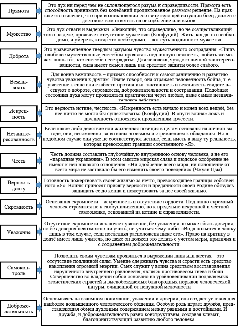 Духовно-нравственный и морально-волевой компоненты в изучении практически всех видов единоборств, в том числе айкидо, неоценимы. В основе всех восточных боевых искусств лежит «кодекс чести». По мнению С.В. Степанова [Степанов, 2007, С. 28] «морально-нравственные постулаты этого кодекса близки по сути принципам человеческого общения, изложенным в мировых религиях: христианстве, буддизме, исламе. Они не вступают в противоречие и с основными положениями православия, исповедующего любовь и уважение к ближнему». На рисунке 1.1 даны характеристики этим качествам.