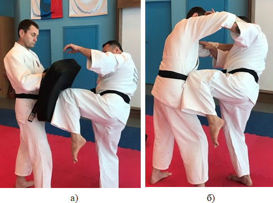 Рис. 18. Техника выполнения удара коленом, где: а) тренировка удара по лапам; б) нанесение удара в поединке