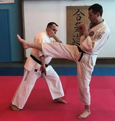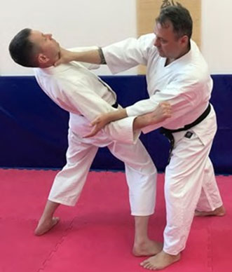 2. После сбива и захвата ударной руки наступаем на стопу. Наносим Уракен и проводим Ирими-наге.