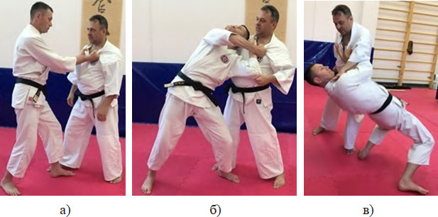 Рис. 39. Освобождение от захвата Рё-муне-дори двумя руками, где: а) захват Муне-дори; б) нейтрализация захвата за локоть со скручиванием шеи; в) после нейтрализации захвата бросок Ирими-наге в горло