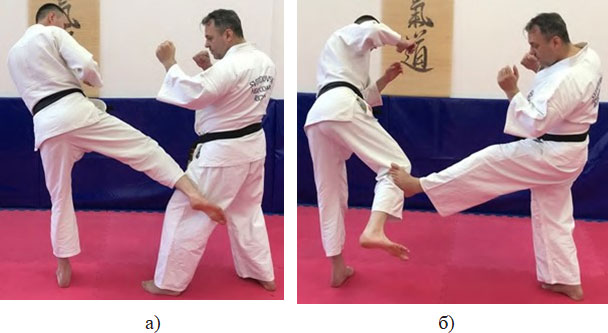 Рис. 42. Подставка стопы (нижний ковш) от удара Лау-кик, где: а) удар Лау-кик; б) подставка стопы (нижний ковш)