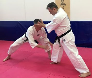 1. Из Хидари-камаэ делаем подставку правой рукой от удара правой руки противника. Одновременно левой рукой хватаем его запястье. Не выпрямляя свою руку, делаем Тэнкан, накручивая соперника на предплечье и выводя его из равновесия. На встречном ходу про-водим Ирими-наге кистью руки в горло.