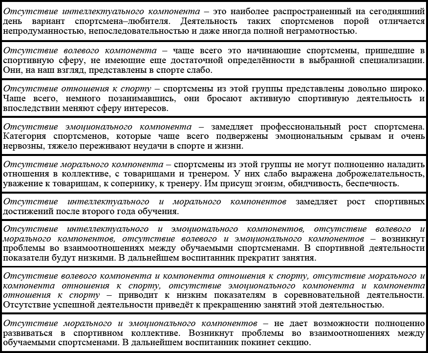 Рисунок 1.4 – Степень выраженности того или иного личностного компонента у спортсменов и влияние отсутствия компонента (ов) на их спортивную деятельность (по материалам [Степанов, монография 2007 С. 59–60])