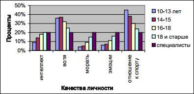 Что касается начинающих юных спортсменов, из 123 свойств и черт характера они оценили как важные только 52: 100 % – «Порядочность», «Уважение к старшим», «Исполнительность», «Трудолюбие», «Внимательность», «Жизнерадостность», «Уважение к товарищам», «Уважение к тренеру», «Выносливость», «Умение преодолевать трудности», «Решительность», «Память», «Ответственность»; 99,9 % – «Добросовестность», «Ответственность», «Терпеливость», «Ум»; 99,8 % – «Требование к себе», «Обучаемость»; 99,7 % – «Доброжелательность»; 99 % – «Самостоятельность», «Темпераментность», «Наличие собственной позиции»; 98,7 % – «Самообладание»; 98,1 % – «Любознательность»; 98 % – «Благодарность», «Учет ошибок», «Эмоциональность»; 97,5 % – «Ответственность»; 97,1 % – «Отношение к неудаче»; 97 % – «Патриотизм», «Отношение к успеху», «Настойчивость», «Пунктуальность», «Быстрая адаптация»; 96,5 % – «Чувство долга»; 96,4 % – «Заботливость»; 96,3 % – «Находчивость»; 96 % – «Целенаправленность», «Умение работать», «Толерантность», «Стремление к победе», «Аккуратность», «Соревновательный дух», «Любознательность»; 95,8 % – «Надежность», «Умение анализировать»; 95,6 % – «Спортивная злость», «Готовность к действию»; 95,4 % – Добросовестность», «Азартность»; 95,1 % – «Внимательность».