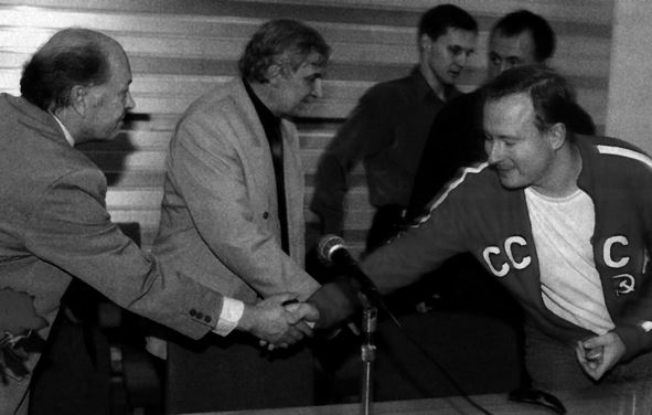 Рукопожатие с Рубиксом на предвыборном собрании в сентябре 2002 года. Второй слева – Петр Иванович Антропов