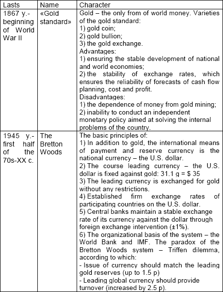 With the development of foreign economic relations and formed the world monetary system as a form of currency relations governed by the national currency laws and interstate relations. The main element of the monetary system of each country is its national currency[8]. Features of the world monetary system and principles of its construction are closely related to the structure of world economy. It is obvious that a change in its structure has evolved and the world monetary system and, consequently, are modified and improved its basic elements: