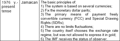 The development of the world monetary system is a spiral with a gap of several decades. In the domestic economy, the monetary systems have evolved from the gold coin standard to a gold bullion and gold exchange, and from him – a paper-credit treatment. Evolving global monetary system has moved to the next stage, called the Jamaican system. It was arranged by agreement of member countries by the International Monetary Fund (IMF) in 1976 in Kingston, Jamaica[9], in which formed the basic principles of a new monetary system, embodied in April 1978 in the second amendment to the Articles of Agreement of the IMF. These principles, which are today, are as follows: