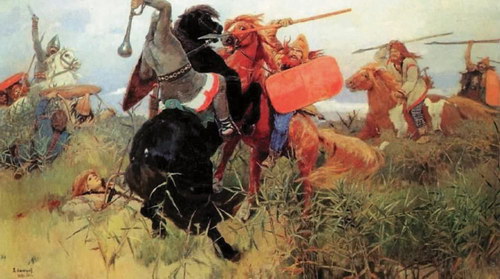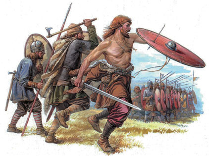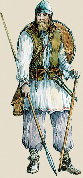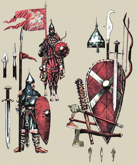Известие Иорнанда о Венедах, без великого труда покоренных в IV веке Готфским Царем Эрманарихом, показывает, что они еще не славились тогда воинским искусством. Послы отдаленных Славян Бальтийских, ушедших из Баянова стана во Фракию, также описывали народ свой тихим и миролюбивым; но Славяне Дунайские, оставив свое древнее отечество на Севере, в VI веке доказали Греции, что храбрость была их природным свойством и что она с малою опытностию торжествует над искусством долголетным. Греческие летописи не упоминают ни об одном главном или общем Полководце Славян; они имели Вождей только частных; сражались не стеною, не рядами сомкнутыми, но толпами рассеянными и всегда пешие, следуя не общему велению, не единой мысли начальника, а внушению своей особенной, личной смелости и мужества; не зная благоразумной осторожности, но бросаясь прямо в средину врагов. Чрезвычайная отважность Славян была столь известна, что Хан Аварский всегда ставил их впереди своего многочисленного войска. Византийские Историки пишут, что Славяне сверх их обыкновенной храбрости имели особенное искусство биться в ущельях, скрываться в траве, изумлять неприятелей мгновенным нападением и брать в плен. Древнее оружие Славянское состояло в мечах, дротиках, стрелах, намазанных ядом, и в больших, весьма тяжелых щитах.