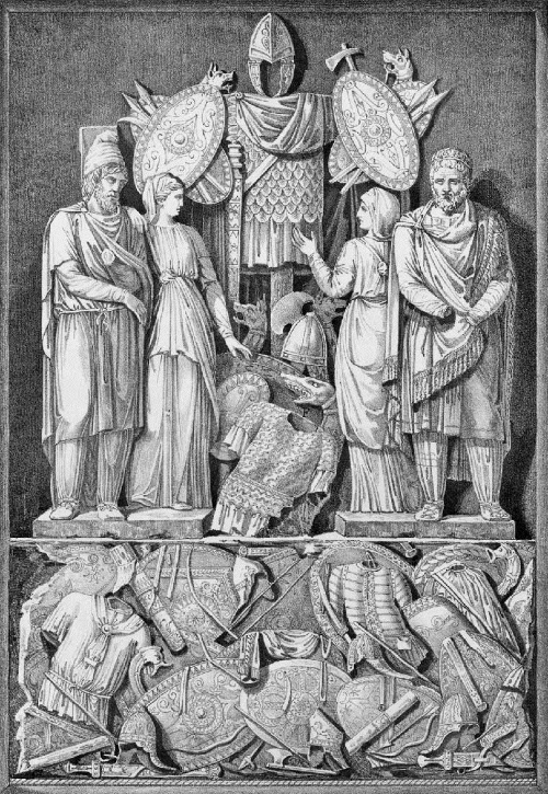 Славяне обожали еще знамена и думали, что в военное время они святее всех идолов. Знамя Бальтийских Вендов было отменной величины и пестрое, стояло обыкновенно в Святовидовом храме и считалось сильною богинею, которая воинам, идущим с ней, давала право не только нарушать законы, но даже оскорблять и самых идолов. Датский Король Вальдемар сжег его в Арконе, взяв сей город. – В числе Ретрских любопытных памятников нашлось также священное знамя: медный дракон, украшенный изображением женских голов и вооруженных рук. В Дитмаровой летописи упоминается о двух Славянских знаменах, которые считались богинями. Хитрость Полководцев ввела, без сомнения, сию веру, чтобы воспламенять дух храбрости в воинах или обуздывать их неповиновение святостию знамен своих.