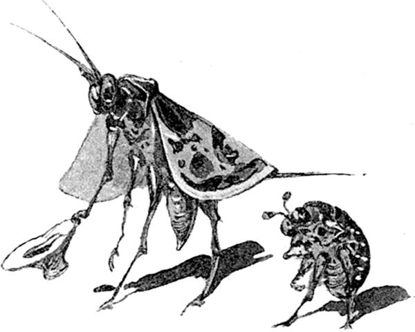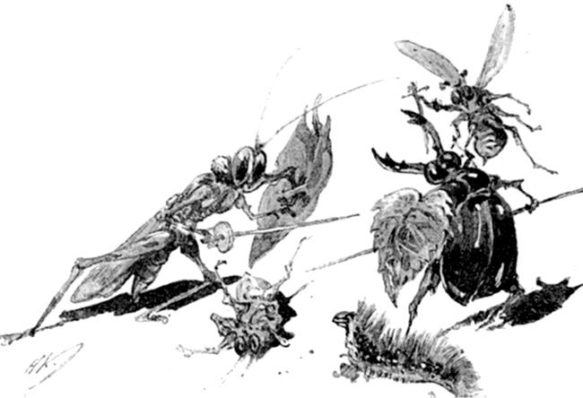 Первыми прилетели легкие мотыльки и яркокрылые бабочки, черные, сердитые шмели и шершни в расшитых золотом, бархатных костюмах, а за ними прискакали светло-зеленые и серебристые кузнечики в блестящих атласных» костюмах, ловкие и смелые скакуны, талантливые музыканты, затем, опоздав немного, приползли жуки – круглые и длинные, усатые и безусые, рогатые и безрогие, в крепких боевых латах и панцирях, сверкавших на солнце всеми оттенками радуги.