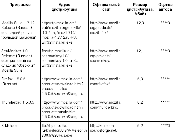 Таблица 1.1. Дистрибутивы программ для Windows корпорации Mozilla