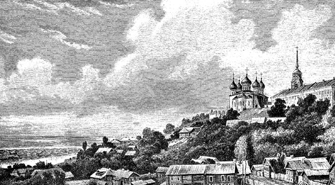 Вид на Успенский собор во Владимире со стороны Клязьмы. Гравюра XIX в.