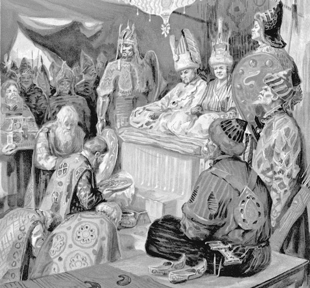 Монголы жили тогда еще совершенно кочевой жизнью, хотя и окружали себя роскошью цивилизации тех стран, которые они покорили и опустошили. Еще постоянных городов у них на Волге не было; зато имелись, так сказать, подвижные огромные города, состоявшие из кибиток, перевозимых на телегах с места на место и разбиваемых по прихоти властелина. Где пожелает хан, там устраивался и существовал более или менее долгое время многолюдный кочевой город. Появлялись ремесла и торговля; потом – по приказанию хана – все укладывалось, и огромный обоз в несколько сот и тысяч телег, запряженных волами и лошадьми, со стадами овец, скота, с табунами лошадей, двигался для того, чтобы через несколько дней пути опять расположиться станом. В такой стан прибыли наши князья. По обычаю их заставили пройти между двумя огнями для очищения от зловредных чар, которые могли пристать к хану. Выдержав это очищение, они допускались к хану, перед которым должны были появиться с обычными земными поклонами. Хан принимал завоеванных подручников в разрисованной войлочной палатке, на вызолоченном возвышении, похожем на постель, с одной из своих жен, окруженный своими братьями, сыновьями и сановниками; по его правую руку сидели мужчины, по левую – женщины. Батый принял наших князей ласково и сразу понял, что Александр, о котором уже он много слышал, выделяется по уму своему из ряда прочих русских князей.