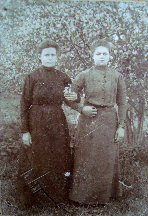 Мы с мамой сели на скамейку и мама, что-то рассказывала, потом вышла тётя Горбенко и позвала нас в дом. Зашли, стол уже был накрыт на обед. Пообедали все вместе. Побыли какое-то время у них. Потом мы собрались, и их дети помогли нам донести домой всякие гостинцы. Это была уже осень 1932 года. Мы жили тогда на Лисовий у бабы Домахи. Мама обучала её дочь Дусю, шуструю и красивую девушку, шитью. На фото: мама (слева) и тётя Дуся Горбенко.