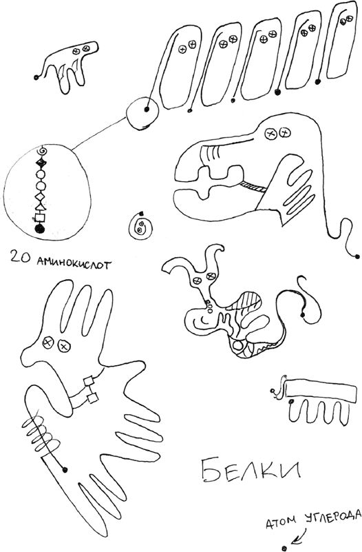 Эти разнообразные белки правят живым организмом. Как рабочие разных профессий, они делают все, что только можно в нем делать. Мы перевариваем пищу с помощью белков, дышим кислородом с помощью белков, двигаемся с помощью белков. Белки копируют ДНК, синтезируют клеточную мембрану, а при формировании долгосрочной памяти белки в гиппокампе отправляют при помощи белков белковые сигналы другим белкам в кору. Всего у человека порядка 20 000 разных белков5, но каждая клетка решает, когда и в каких количествах производить из них тот или иной белок.