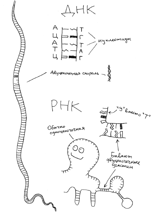 РНК куда менее стабильна, чем ДНК, – постоянная головная боль для биохимиков, пытающихся ее исследовать. Она ретива и мимолетна, но в каком-то смысле гораздо более талантлива, чем ее статная родственница ДНК. ДНК не умеет делать ничего и только торжественно хранит покой содержащихся в ней генов. РНК не сравнится с белком в плане талантов, но в принципе умеет делать множество вещей, иногда даже вступая в принципиально важные химические реакции. Ее жизнь коротка, а по размерам она редко превышает тысячу-другую нуклеотидов (хотя и при такой длине РНК крупнее большинства белков).