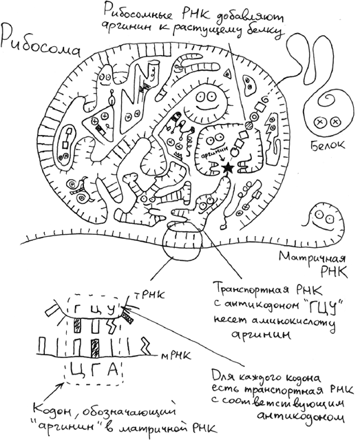 Куда несут свое послание РНК-посланники? На рибосому. Это, напомню, огромная молекулярная машина, можно сказать станция, на которой производятся белки, где нуклеотидный язык переводится на аминокислотный. Она умеет брать «генетическое послание», матричную РНК, и, пропуская через себя шагами в три нуклеотида, параллельно собирать соответствующий белок, бусина за бусиной. В зависимости от того, какую матричную РНК вставить в рибосому, она может произвести любой белок. Рибосому можно считать древнейшим компьютером, работающим по алгоритму генетического кода.
