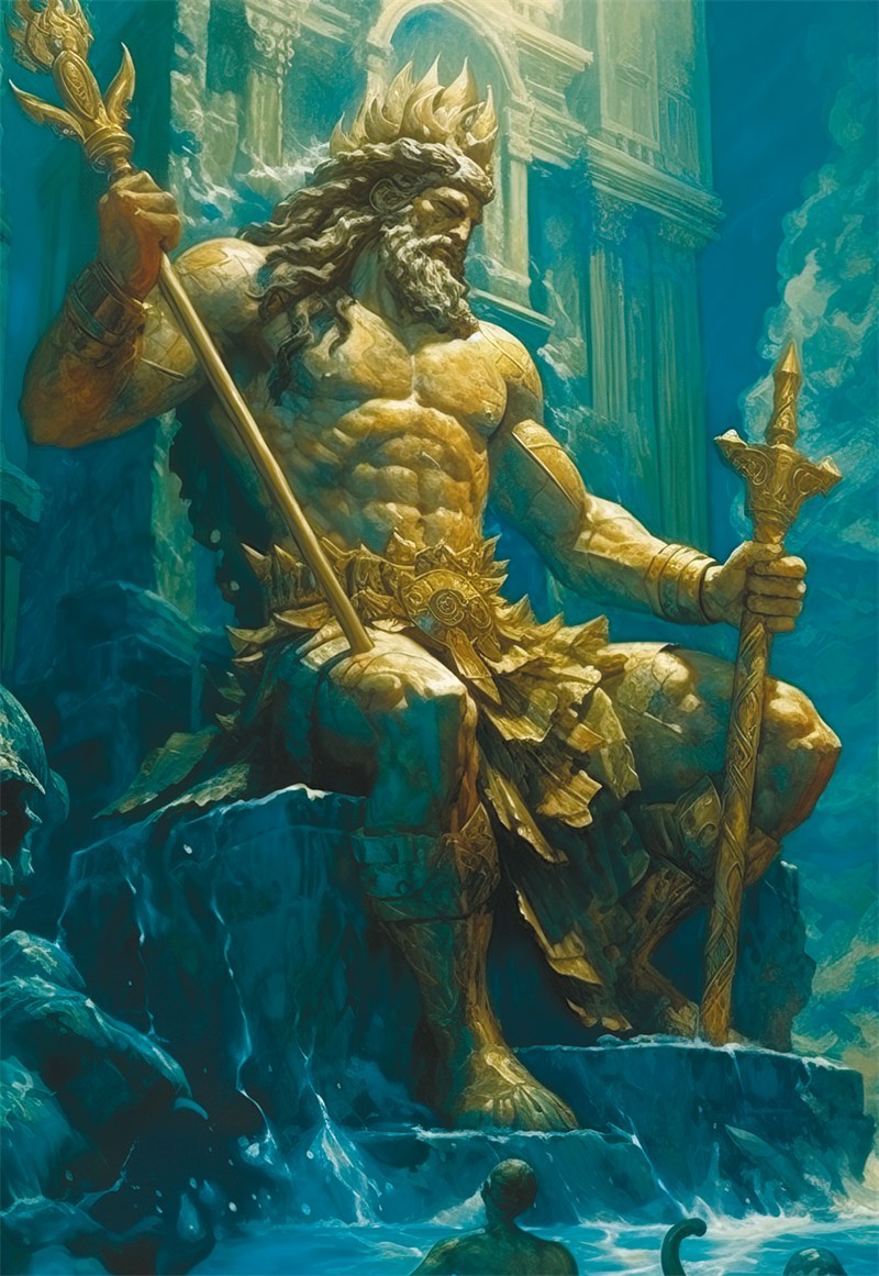 Посейдон властвует над морем. Когда он на своей колеснице, запряженной дивными конями, мчится по морю, расступаются вечно шумящие волны. Равный красотой самому Зевсу, быстро несется Посейдон по безбрежному морю, а вокруг него играют дельфины, рыбы выплывают из морской глубины и теснятся вокруг его колесницы. Когда же взмахнет Посейдон своим грозным трезубцем, тогда словно горы вздымаются морские волны, покрытые белыми гребнями пены, и бушует на море свирепая буря. Бьются с шумом морские валы о прибрежные скалы и колеблют землю. Но простирает Посейдон свой трезубец над волнами – и они успокаиваются. Стихает буря, снова спокойно море, ровно, как зеркало, и чуть слышно плещется у берега – синее, беспредельное.