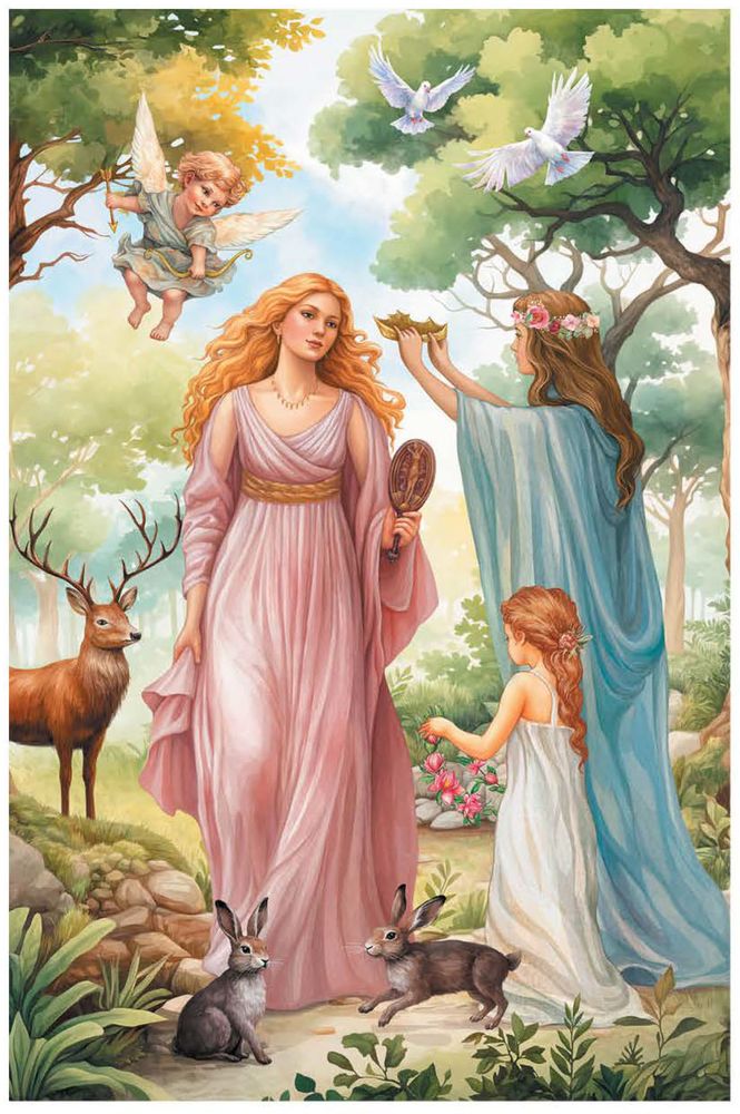 Никто не может избежать её власти, даже боги. Только воительница Афина, Гестия и Артемида не подчинены её могуществу. Высокая, стройная, с нежными чертами лица, с мягкой волной золотых волос, как венец лежащих на её прекрасной голове, Афродита – олицетворение божественной красоты и неувядаемой юности. Когда она идёт, в блеске своей красоты, в благоухающих одеждах, тогда ярче светит солнце, пышнее цветут цветы. Дикие лесные звери бегут к ней из чащи леса; к ней стаями слетаются птицы, когда она идёт по лесу. Львы, пантеры, барсы и медведи кротко ласкаются к ней. Спокойно идёт среди диких зверей Афродита, гордая своей лучезарной красотой. Её спутницы оры и хариты, богини красоты и грации, прислуживают ей. Они одевают богиню в роскошные одежды, причёсывают её златые волосы, венчают её голову сверкающей диадемой.