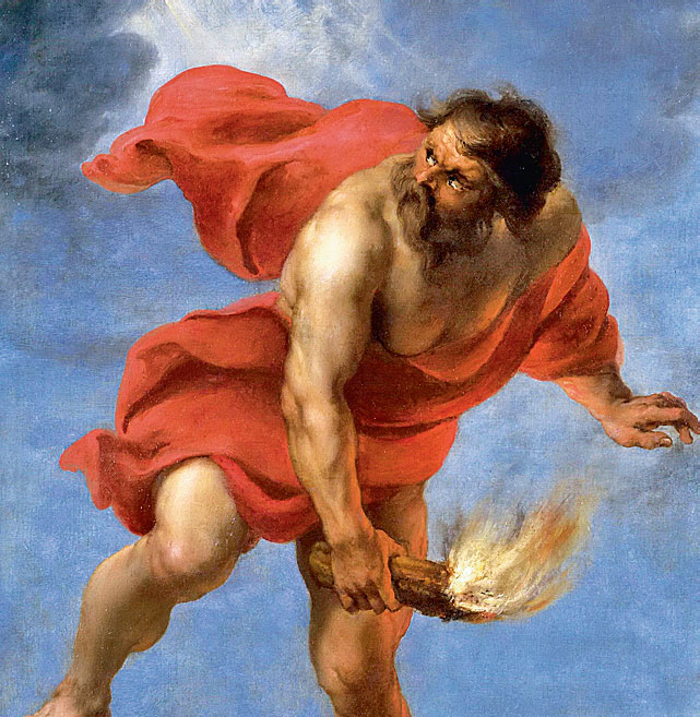 Прометей рассказывает им, как помог он Зевсу в борьбе с титанами, как убедил мать свою Фемиду и богиню земли Гею стать на сторону Зевса. Зевс победил титанов и сверг их, по совету Прометея, в недра ужасного Тартара. Завладел Зевс властью над миром и разделил ее с новыми богами-олимпийцами, а тем титанам, которые помогали ему, не дал громовержец власти в мире. Зевс ненавидит титанов, боится их грозной силы. Не доверял Зевс и Прометею и ненавидел его. Еще сильнее разгорелась ненависть Зевса, когда Прометей стал защищать несчастных смертных людей, которые жили еще в то время, когда правил Крон, и которых Зевс хотел погубить. Но Прометей пожалел не обладавших еще разумом людей; он не хотел, чтобы сошли они несчастными в мрачное царство Аида. Он вдохнул им надежду, которой не знали люди, и похитил для них божественный огонь, хотя и знал, какая кара постигнет его за это. Страх ужасной казни не удержал гордого, могучего титана от желания помочь людям. Не удержали его и предостережения его вещей матери Фемиды.