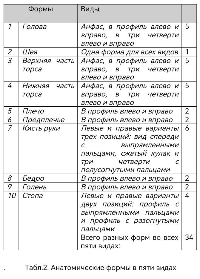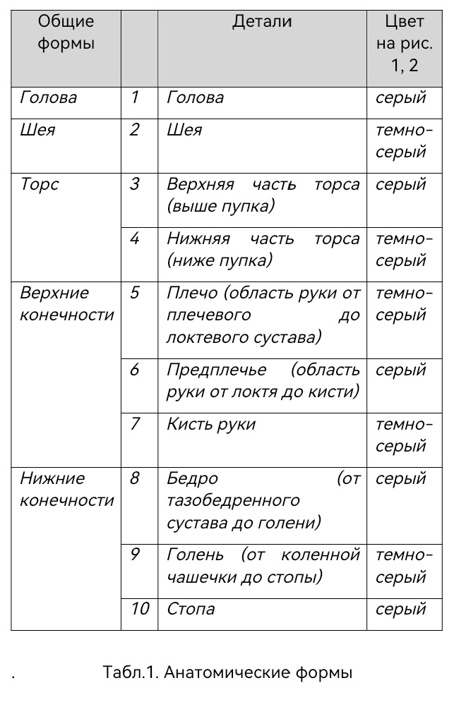 Теперь рассмотрим состав фигуры немного подробнее, то есть так, как это изображено на рис. 1. Фигура человека на этом рисунке составлена из 16 форм, включая парные. Если же парные формы не считать, получится всего 10 форм, каждая из которых имеет свое название. Эти названия вам, должно быть, тоже давно известны, но все-таки давайте их пересчитаем, чтобы ничего не забыть (Табл. 1).
