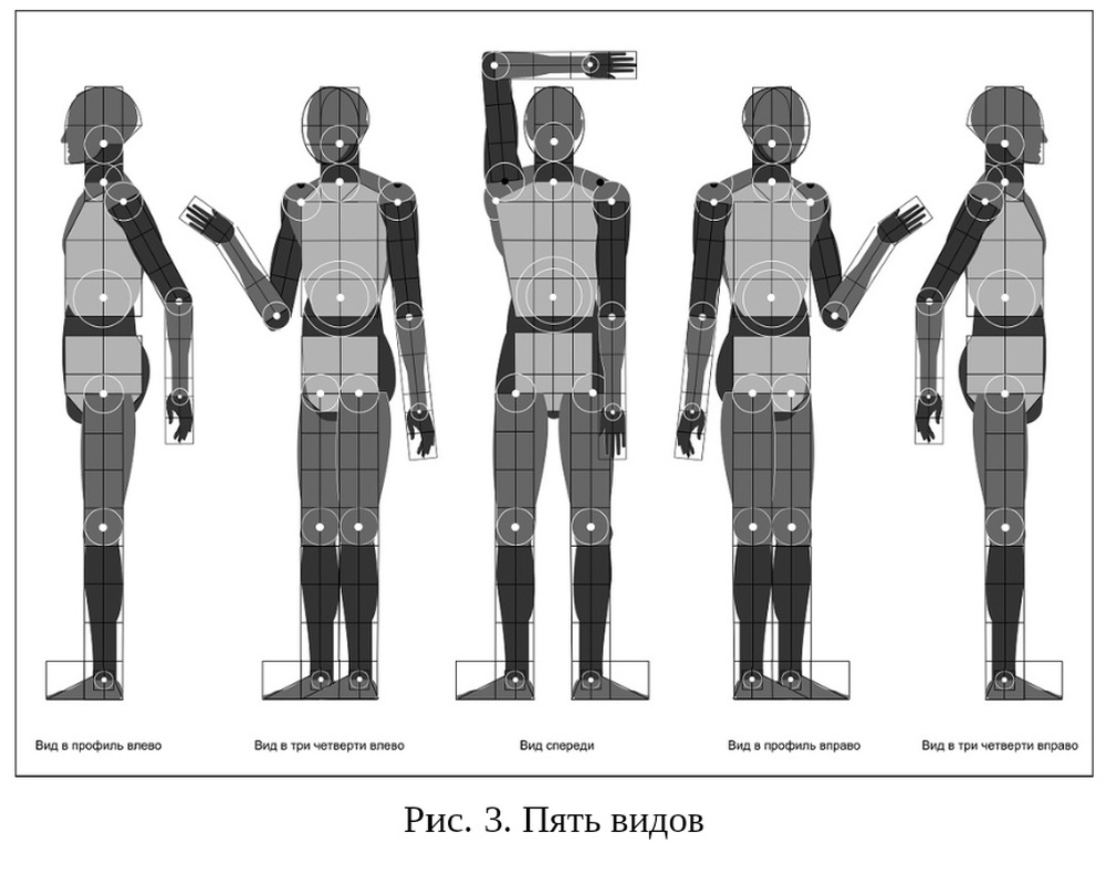 С другой стороны, левые и правые виды по своим формам и пропорциям не отличаются. И на посвященных этим темам иллюстрациях изображены только три основных вида фигуры: 1) фас (рис. 1); 2) профиль влево (рис. 2); 3) три четверти влево (рис. 2).