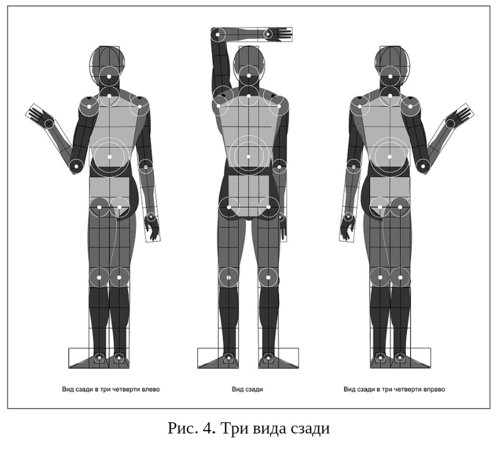 Все-таки и восьми видов для начала многовато. Но мы не зря выбрали силуэтную графику, в которой, как правило, отличить вид сзади от вида спереди невозможно. То же самое относится и к направленным вперед и назад трехчетвертным видам. Поэтому на представленных в конце этой книге шаблонах для сборки фигур даны всего пять видов (рис. 38–47).