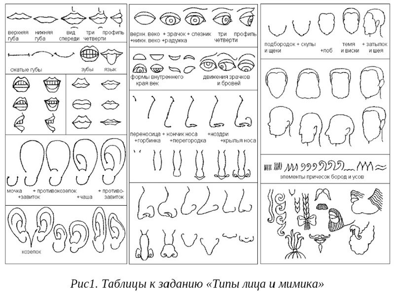 5.Выполнить эскизы типажей, используя заданные элементы. Любые новые элементы следует составлять из геометрически четких, легко воспроизводимых линий: прямых, волнообразных, дугообразных. В зависимости от характера типажа допускается произвольное изменение пропорций как общей формы лица, так и отдельных деталей. Вместо светотени используется окраска равномерным тоном или текстура орнаментального характера.