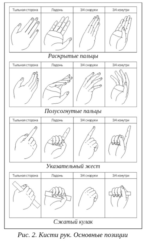 Для изображения взаимодействия персонажей в комиксе довольно часто возникает необходимость нарисовать кроме лиц героев сюжета также и их руки. Для этого могут быть использованы зарисовки с натуры, однако, в случае затруднений, можно выбрать одну из приведённых далее 16 основных позиций кисти руки.